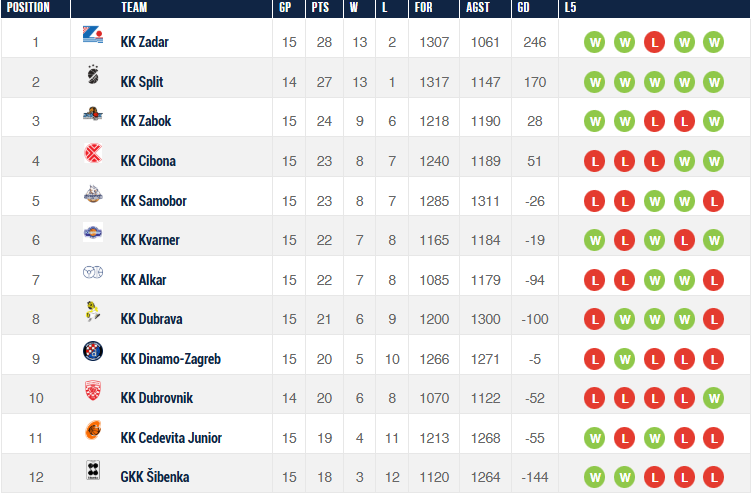 Vodeća momčad lige, Split, je uspješno odradio još jednu prepreku, ovoga puta u Sinju protiv Alkara. Žuti su tako došli do jedanaeste uzastopne pobjede, no trenutno su na drugom mjestu iza Zadra, isključivo zbog utakmice manje. Upravo je Zadar na svom parketu bez većih problema došao do pobjede nad Samoborom, koji je aktualnom prvaku pružio vrlo dobar otpor.
