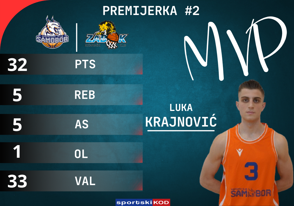 1.Luka Krajnović (Samobor-Zabok)-32 poena (9/14 šut), 5 sk, 5 as, 1 ol-val 33