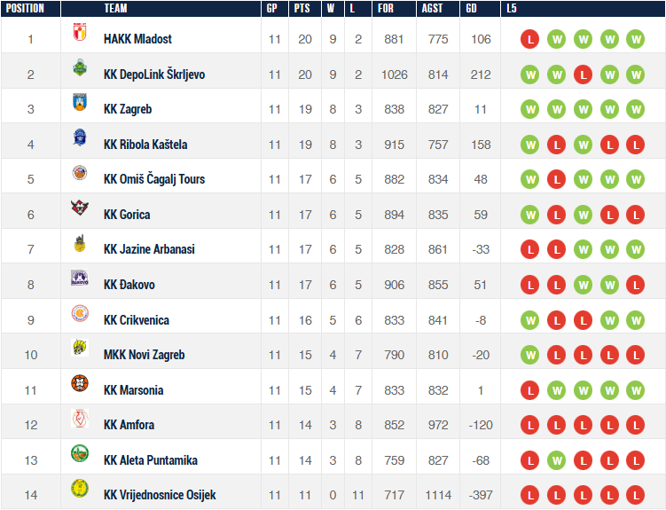 U novu godinu sa vodećih pozicija su ušli Mladost i Škrljevo, sa identičnim omjerom 9/2, s time da je Mladost u nešto vedrijem raspoloženju odradila kraj godine, povezavši četiri pobjede, a na tom putu ih nije ni poremetila trenerska promjena, u kojoj je Luka Pešut preuzeo starijeg brata, Cedevitu, a na njegovo mjesto stigao Ivan Kapov. Škrljevo je u posljednjih pet utakmica upisalo četiri pobjede i jedan poraz, upravo od Mladosti, a momci Petra Maleša se mogu pohvaliti napadačkom raznovrsnošću, čemu svjedoče čak 1026 poena, odnosno malo preko 93 poena po utakmici.